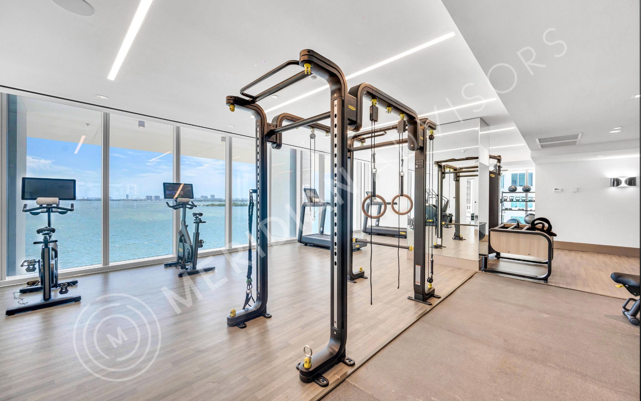 - Expansive and fully-equipped gym with 180° views of the bay